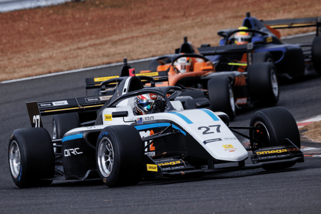 A lock up at the start of the second race saw Ogawa drop from first to fourth. But he climbed back up to second and secured 18 important points as Sceats entered pit lane on the second lap and retired following a big lock-up entering turn one.