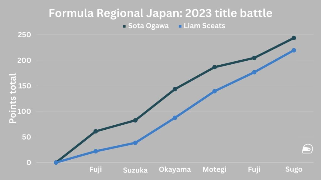 As torrential rain hit Suzuka on race day, the first race of two was suspended following two laps behind the safety car. Half points were awarded, so as polesitter Kazuki Oki took victory, Ogawa received nine points for finishing second and Sceats 7.5 for third.