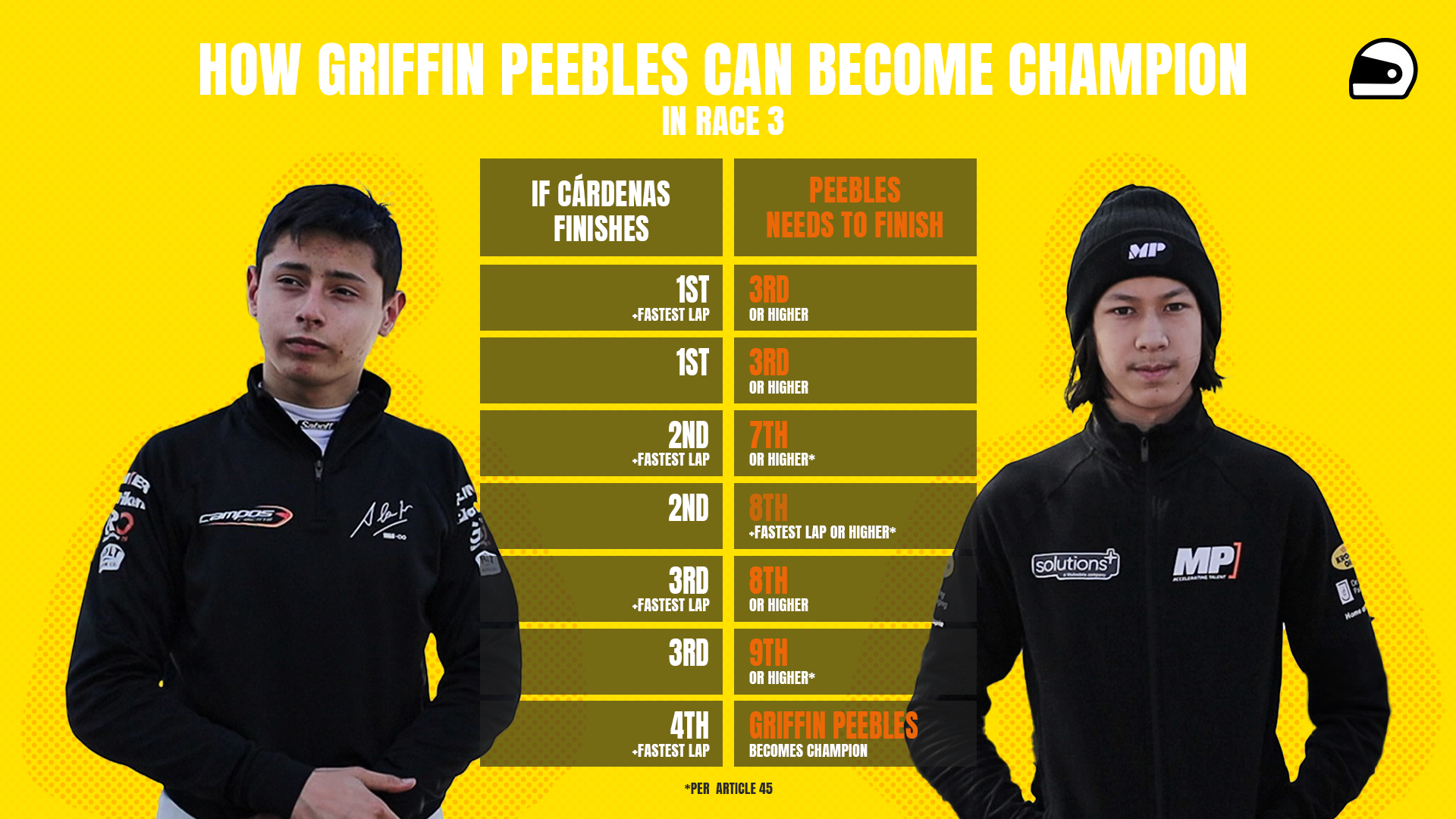 With just the final race to go and 26 points up for grabs, Peebles led the drivers’ standings with 147 points, ahead of Cárdenas with 134 points. Being second in the championship, Cárdenas won two races ahead of the final race of the season, while leader Peebles won three races and therefore had an advantage going into the final race in the event of a tie in points.