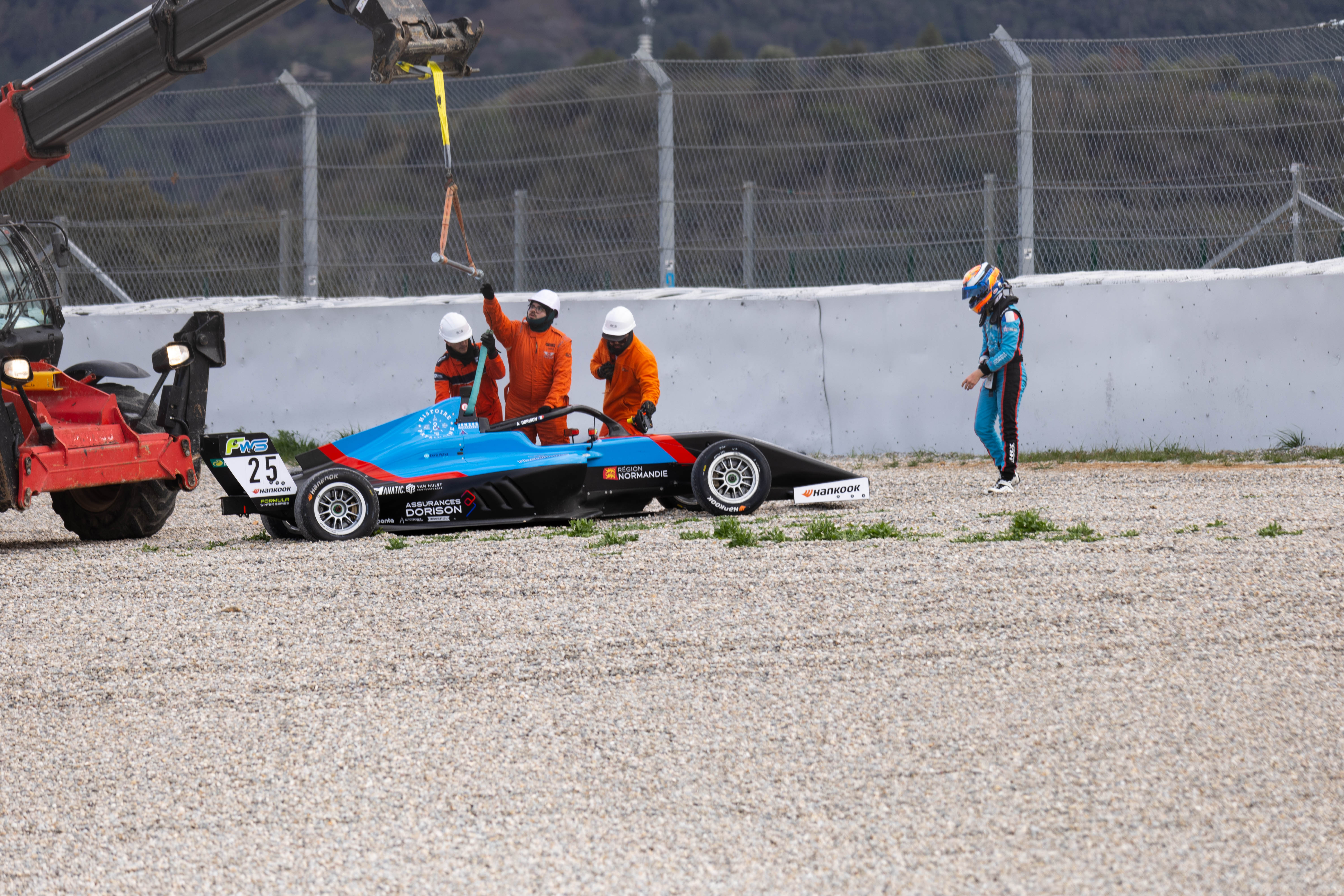 The race resumed with 6:02 minutes to go. As in the previous restarts, Peebles kept his lead, but this time Cárdenas stayed close behind him. The race action, however, was again neutralised with five minutes to go. Jenzer’s Ádám Hideg couldn’t accelerate out of the final corners and stopped on the start-finish straight, while teammate Arthur Dorison came to a stop in Turn 1, possibly because of a collision. The Jenzer driver got out but sat down next to his car and held his hand with what appeared to be a wrist injury.