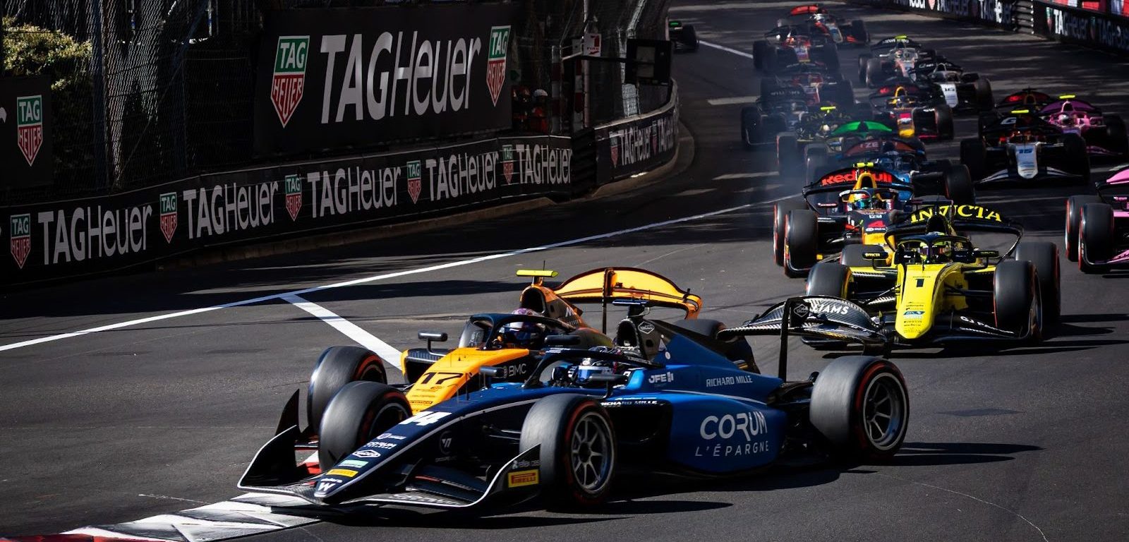 After two laps behind the safety car, Fornaroli led the 15 remaining drivers away for the first period of green-flag running. On the second lap after the restart, Joshua Dürksen, running seventh, misjudged the braking point of Kush Maini ahead of him at La Rascasse and hit the rear of the DAMS. Maini continued unscathed, but the contact sent Dürksen into the barriers and out of the race, causing a virtual safety car.