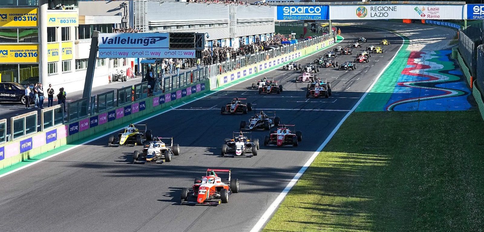 Gomez capitalised on the chaos to steal the lead, which he preserved until the end to collect his first Italian F4 win. R-ace GP’s Powell and Olivieri fought for second for much of the race, with Olivieri passing his teammate at Cimini 1 on lap nine. Salim Hanna then took third from Powell at the same spot on the last lap.