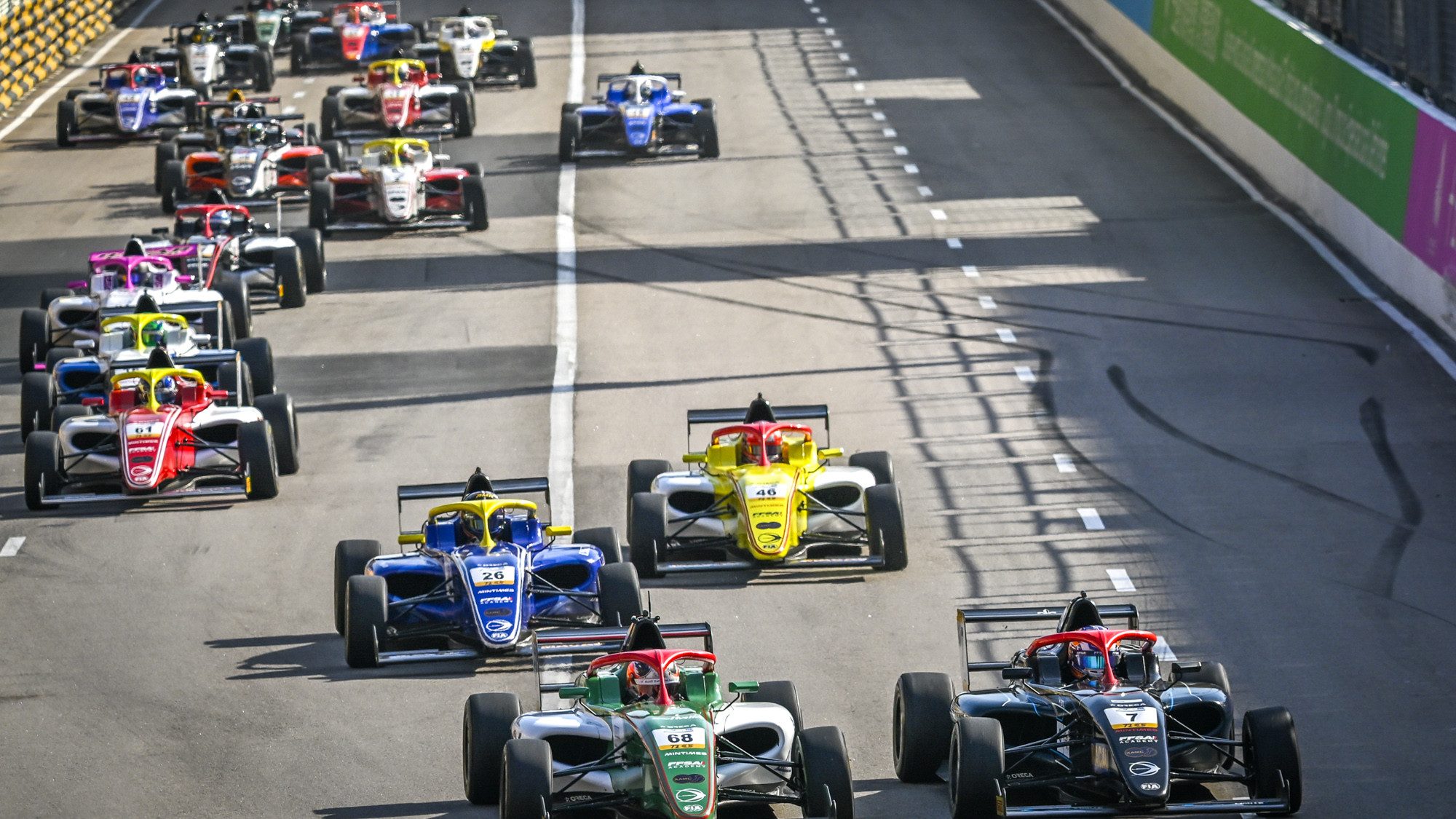 The safety car came back in at the end of the second lap, with Roussel getting a good launch to lead Caretti heading into the first corner and Olivieri and Ary Bansal in hot pursuit. Sato made a pass on Chan for fifth at Mandarin, while McLaughlin also overtook Chan down the straight heading into Lisboa.