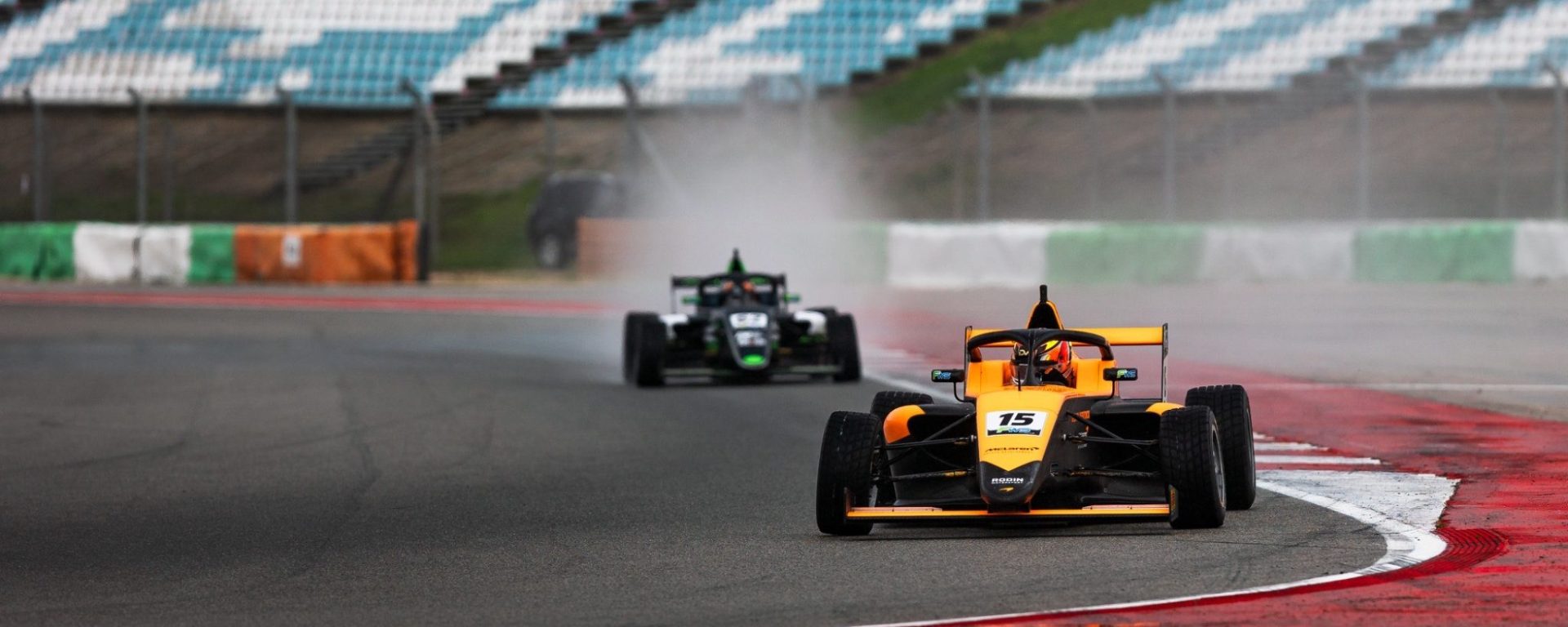 Race control decided on a rolling start for race two, which likewise began on a wet track. Entering the first corner, Van Langendonck snatched the lead after polesitter Lennon went wide, while fifth-place starter Oleksandr Savinkov spun following minor contact with Rocco Coronel